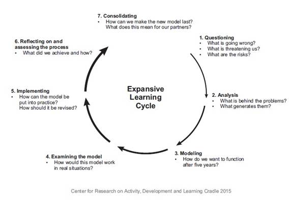 Expansive learning (EL) is a method of intervention, developed in Finland by Engeström and his colleagues since the 1980s, based on Vygotsky’s method of double simulation (ENGESTRÖM, 2007; SANNINO, 2008). The theory of expansive learning focuses on learning processes in which the very subject of learning is transformed from isolated individuals to collectives and networks (ENGESTRÖM, 2016). As shown in Diagram 2, EL is a spiral characterised by specific epistemic or learning actions.