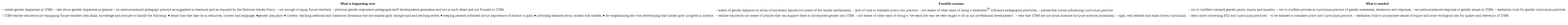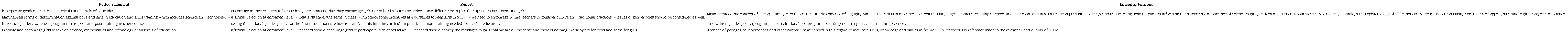 Participants worked in small groups for a focus group discussion, to discuss whether and/or how as teacher educators they are responding to such policy pronouncements. Midway, participants raised the need to have a lecturer in charge in every group as some of the policy pronouncements require input from management. Participants were reminded that input from Focus Group Discussion was to feed into the problem solving question: Are we doing enough in teacher education to equip future teachers with the required knowledge, skills, values and attitudes to handle gender issues in STEM learning? To cover more ground in the short time provided, we agreed that each Focus Group Discussion concentrate on two of the policy statements in Board 2. We also agreed that each Focus Group Discussion should discuss policy statement 1, because it was critical to curriculum practice. Flip chart summaries came as shown in Board 3. The column emerging tensions shows reveal contradictions within the TE activity system. With reference to the diagnostic questions in Figure 1, it emerged that although teacher educators could see gender disparities in terms of enrolment and retention, they did not possess the required tools and analytical lenses to undertake a deeper analysis of the causes of such gender disparities and the implications for girls studying STEM, nor did they have capacity for working against these in their practice.