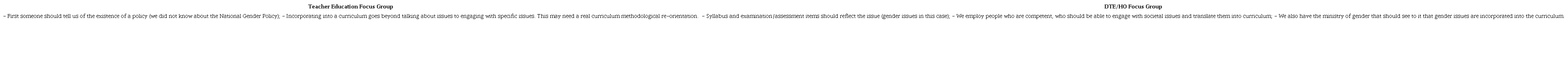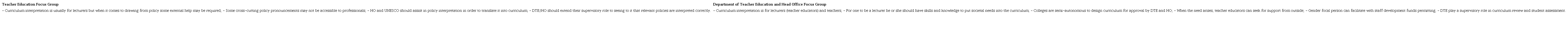 As before, we had two focus groups to deliberate research findings and to try to answer the question. However the two groups were heterogeneous this time. Teacher educators were mixed with DTE and HO officials in each group, so that teacher educators could share the challenges that they face in implementing the policy pronouncements into the curriculum. Also, this would allow the opportunity for DTE and HO officials to make explicit their understanding of the object of curriculum transformation through policy implementation. The drive behind this was to encourage perspective making and perspective taking as reflexive processes in boundary learning. Boland Junior and Tenkasi (1995) referred to perspective making as making explicit one’s understanding and knowledge of a particular issue, while perspective taking involves taking the other into account, in light of a reflexive knowledge of one’s own perspective.