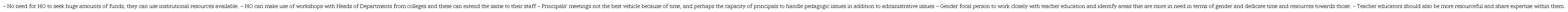 The gender focal person also added her weight to this: “we are in touch with a few organizations that can provide staff development for our teacher educators and probably produce teaching materials. When I get to the office, after this I am sure I can mobilize some resources and we can do the syllabus review together.” (verbal information). These extracts show participants’ commitment to new ways of doing work. Sannino (2008, p. 240) referred to this as “commissure speech acts”. She further argued that such talk is agentive because it conveys that things are doable and shows an intention to act in specific ways.