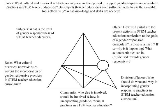 The purpose of this Change Laboratory was to provide a space for all the activity systems to come together and reconceptualize the object (coming up with a gender responsive STEM teacher education curriculum). The idea was to build on what Engeström (2007) refers to as distributed agency or collective intentionality. The process was meant to facilitate boundary learning across activity systems.