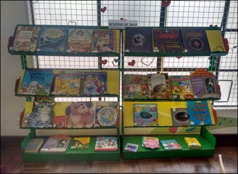 A formação de um espaço criativo e estimulante destinado à leitura é uma estratégia que incide diretamente nesse aspecto, possibilitando o desenvolvimento do interesse pela leitura. Nesse caminho, uma questão favorável observada no campo de pesquisa são indicações expostas, exemplificadas na Fotografia 3, pela diferente disposição de alguns livros para leituras iniciais. Títulos diversos, formatos diferentes, cores vibrantes, mas, sobretudo, os livros com as capas voltadas para a frente atraem a atenção do potencial leitor que pode manipular todos os livros dispostos na estante e explorar quais podem ser as suas possíveis preferências.
