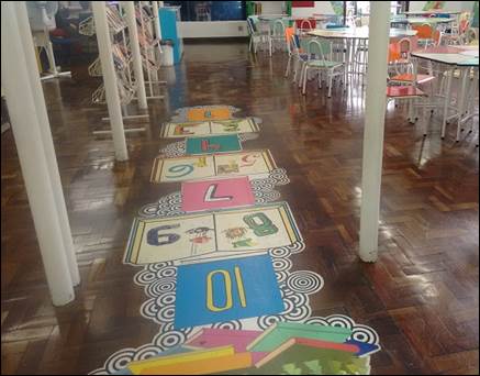 Colocando a criança, dentro de suas especificidades, no centro do processo e, consequentemente, dos seus objetivos, a seção infantil da BPP demonstra, em seu espaço e programação, o estímulo ao lúdico, ou seja, dispõe de ações que atraem o público infantil. Um exemplo que podemos verificar está na Fotografia 4, que retrata a amarelinha. No chão da seção, mostra-se à criança que a literatura pode ser associada a um momento leve e prazeroso, no qual uma brincadeira pode ser realizada entre uma leitura e outra.