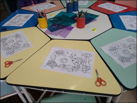 Para Marangon (2010, p. 46), a biblioteca “[...] deve propiciar ouvir e contar histórias, brincar com jogos educativos e recreativos [...] e ter uma seção de arte que estimule a pintura, a escultura e os desenhos.” Nesse sentido, a seção infantil da BPP proporciona às crianças algumas oficinas, como podemos ver na Fotografia 5, sempre ligadas à “Hora do conto”.