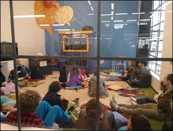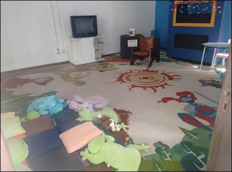 Sentimos que esse é o espaço mais aconchegante da Biblioteca. Ele possui um tapete personalizado, muitas almofadas, televisão, dvd, plotagens nas paredes e um palco de teatro de fantoches, além de conter duas portas de entrada e paredes de vidros, pelas quais é possível observar, para quem chega à seção infantil da BPP, as histórias ali contadas. O cuidado com o planejamento e a manutenção desse espaço é indicativo do lugar que a “Hora do conto” possui nessa seção da Biblioteca, considerada pelos funcionários como “carro-chefe”.
