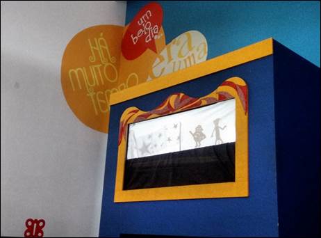 Segundo Silva (1990 p. 46), cada “[...] apresentação tem vantagens especiais, corresponde a determinados objetivos, e saber o recurso é fundamental. As formas de apresentação devem ser alternadas e definidas dependendo do local e das circunstâncias [...]” Nas observações realizadas na seção infantil da BPP houve uma pequena variação metodológica da hora do conto. Apesar de, na maioria das vezes, ser utilizado o teatro de fantoches, houve uma semana dedicada ao teatro de sombras, conforme apresentamos na Fotografia 8.