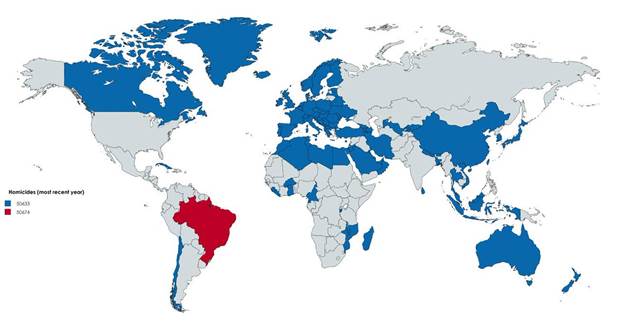 Há um mapa que circula nas redes sociais e que tem chocado ainda mais a nossa autoestima, nesse quesito, já bastante afetada. Ele foi publicado pelo ONL Maps e mostra a soma dos assassinatos em diversos países do Globo, estando o Brasil acima dos índices de violência de vários países do mundo juntos, incluindo quase toda a Europa, parte do Oriente Médio e África, além de gigantescas nações como Canadá, Japão, Austrália e China.