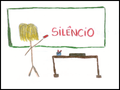 O professor aparece como um sujeito autoritário, durão, que grita na sala de aula, transmite medo, castiga e pune seus alunos com a perda do recreio (Desenho 2). Um professor que tem problemas com o domínio da turma, exigindo sala silenciosa, turma quieta e educada (Desenho 1). No que tange a essa questão, relatam as crianças: