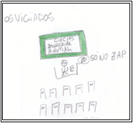 Em uma vertente mais crítica e reflexiva, a relação de poder surge, nos discursos dos alunos, como uma questão de ética, fator primordial nas relações interpessoais (Desenhos 5 a 7). O Desenho 7, por exemplo, expressa a insatisfação com relação ao uso do celular dentro da sala de aula apenas como exclusividade do professor. Esclarece o aluno que o “professor é muito legal, mas só quer ficar no whatsapp.” (P73). Outro aluno tenta justificar a violação das regras da escola, ao expressar que “o professor gosta de mexer no celular, mas ele só mexe depois que passa a atividade.” (P67). Em contrapartida, é evidenciado por alguns alunos que esse fato prejudica o andamento das atividades porque o professor “[...] deixa de dar aula para ir mexer no celular” (P71), chegando a qualificá-lo a um viciado e reclamando da não reciprocidade: “aqui na escola é proibido o uso de celular, mas ele pode usar nas aulas dele. Eu acho isso errado! Por que ele pode e nós não podemos?” (P67) (informações verbais).