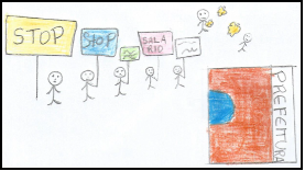 Encontra-se nas representações dos alunos uma conotação negativa do ser professor, delineado pelas dificuldades presentes no contexto de trabalho, como as inúmeras obrigações que tem de desenvolver: chamadas, atividades, avaliações, tendo que enfrentar, ainda, a falta de respeito e indisciplina dos alunos (Desenhos 8 e 9). Expressam os discentes que, “[...] alguns alunos são desobedientes e fazem bagunça, e o professor fica triste” (P11), além de “[...] responder o professor e fazer tumulto nas aulas.” (P26) (informações verbais).