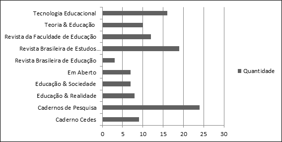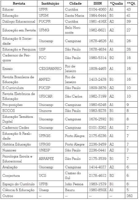 A Revista Educar, da UFPR no Paraná, tem a maior quantidade de publicações, corresponde a 9,72% das publicações nacionais sobre o tema, seguida da Revista Educação, da UFSM do Rio Grande do Sul, que corresponde a 9,27% das publicações nacionais.