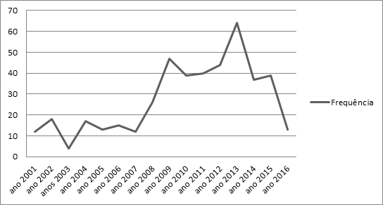 A frequência dessas pesquisas, nesse quindênio, está apresentada no Gráfico 2. O referido gráfico apresenta a variância de produção entre os seis primeiros anos, seguida de um progressivo aumento de pesquisas, alcançando o seu primeiro pico no ano 2009, e o pico máximo no ano 2013. Em seguida, observa-se uma forte queda das produções que quase iguala o período inicial ao final desse quindênio, ou seja, os anos 2001 e 2016, sendo 12 e 13 publicações, respectivamente. O pico máximo da quantidade de produções somou 64 pesquisas, o que representa 14,47% de todo o apanhado.