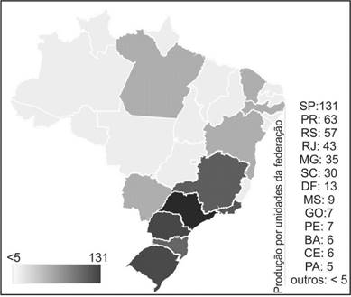 O Gráfico 3 apresenta a quantidade de pesquisas no território brasileiro. Os tons mais intensos representam a maior quantidade de produções e as mais tênues representam o contrário. Na apresentação dos dados, no referido gráfico, foram utilizados como critério de corte os Estados que publicaram menos de cinco artigos, a fim de destacar os lugares que mais publicaram.