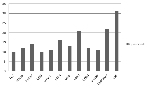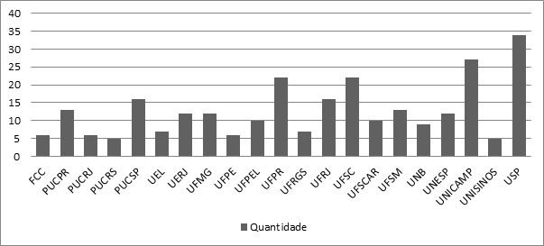 A USP apresenta a maior quantidade de produções, com 7,29% das pesquisas nacionais sobre o tema. A Unicamp apresenta a segunda maior quantidade de produção, com 6,10% das pesquisas nacionais. A UFPR e a UFSC representam, igualmente, 4,97% das pesquisas nacionais, sendo estas as maiores quantidades da região Sul.