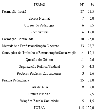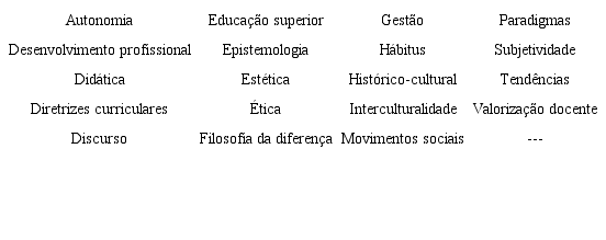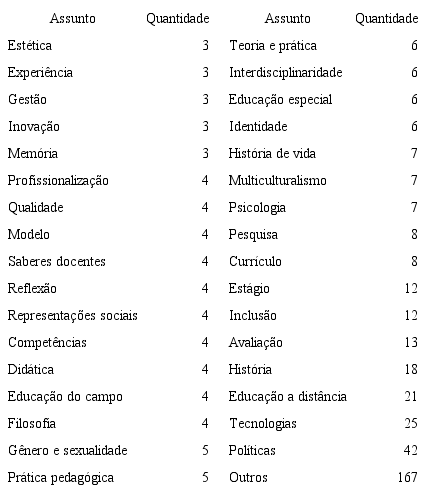 Cada grande categoria anteriormente mencionada foi constituída por subcategorias, das quais destacamos as temáticas, que também se fizeram presentes na pesquisa que originou este artigo, quais sejam: fundamentos epistemológicos, filosóficos, sociológicos, antropológicos, históricos, psicológicos, didática, políticas de formação (educação a distância, Educação de Jovens e Adultos (EJA), curriculares, educação inclusiva, valorização da docência e profissionalização), história institucional, estágio supervisionado, avaliação, experiência, pesquisa, prática pedagógica, educação especial, trabalho docente, tecnologias, identidade, representações sociais, saberes, competências, inclusão, gênero e gestão.