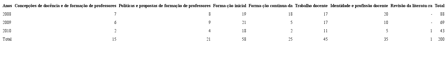As categorias eleitas repetem as da pesquisa do período de 2003-2007, quais sejam: Concepções de Docência e de Formação de Professores; Políticas e Propostas de Formação de Professores; Formação Inicial; Formação Continuada; Trabalho Docente; Identidade e Profissionalização Docente; e Revisão de Literatura.