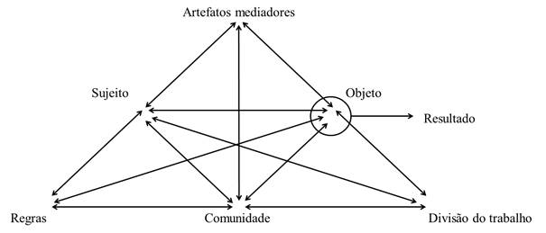 No modelo da Figura 3, Sujeito refere-se ao indivíduo ou grupo, cuja posição e ponto de vista são tomados como perspectiva de análise, e Objeto refere-se à matéria-prima ou problemática para a qual a atividade está dirigida. O Objeto é transformado em Resultado com a ajuda dos artefatos mediadores. Estes podem ser materiais (ferramentas) ou simbólicos (signos) e medeiam as ações. Na Comunidade, estão outros indivíduos e subgrupos que compartilham o mesmo Objeto da atividade em questão. A Divisão do Trabalho marca a divisão horizontal de tarefas e a divisão vertical de poder (hierarquia) que existe no sistema de atividade. As Regras dizem respeito às regulações, às normas e às convenções, tanto explícitas quanto implícitas, que restringem as ações naquele sistema de atividade (ENGESTRÖM; SANINNO, 2010).