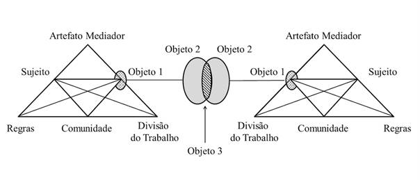 Estabelecido o modelo mais simples (essencial) de sistema de atividade, Engeström (2002) avança na discussão teórica, focando na interação entre dois ou mais sistemas. A partir dessa mudança, tem-se a terceira geração da Teoria da Atividade. Representando-a, Engeström propõe o modelo da Figura 4.