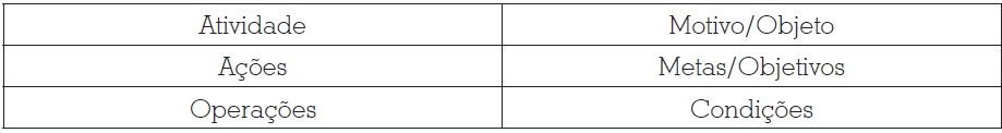 Além do caráter objetal, para compreender a estrutura da atividade, Leontiev (1978, 1983) aponta para a análise dos seus componentes: as ações e operações. Enquanto a atividade pode ser identificada pelo objeto (ou motivo), as ações o são pelo seu objetivo (ou meta) e as operações, pelas condições instrumentais (ou condições operacionais) para sua realização. O Quadro 1 esquematiza, a partir do exposto pelo autor, essa estrutura.