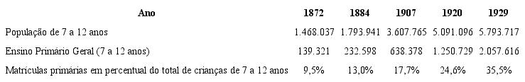 Conforme é possível observar na Tabela 1, as reformas estaduais, a despeito de suas limitações, contribuíram para um aumento do número de matrículas do ensino primário geral (7 a 12 anos), passando de 1.250.729 matrículas em 1920 para 2.057.616, em 1929, ou seja, de 24,6% para 35,5% do total das crianças em idade escolar da época (NAGLE, 2009; IBGE 2006a).