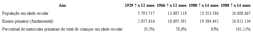 Apenas no final da década de 1980, como se pode observar na Tabela 2, a taxa de frequência escolar bruta no ensino obrigatório correspondia ao número de crianças dessa faixa etária. Em 1980, as 19,4 milhões de matrículas de 1º Grau representavam 83% da população entre 7 e 14 anos (23,3 milhões de crianças); em 1988, as 26,8 milhões de matrículas do 1º Grau correspondiam a 101% dos 23,6 milhões das crianças e jovens entre 7 e 14 anos (IBGE, 2006b, p. 1, 2006e, p. 1). A frequência escolar líquida de crianças e jovens de 7 a 14 anos era de 85% em 1985; 89% em 1988 e de 96,9% em 1992 (INSTITUTO NACIONAL DE ESTUDOS E PESQUISAS EDUCACIONAIS ANÍSIO TEIXEIRA, 2003a; IBGE, 2003).
