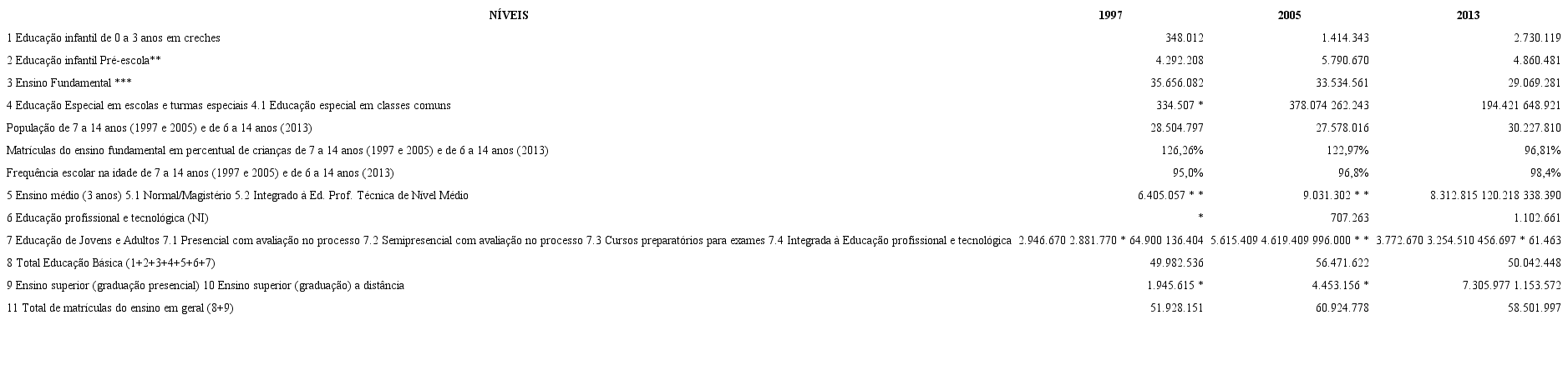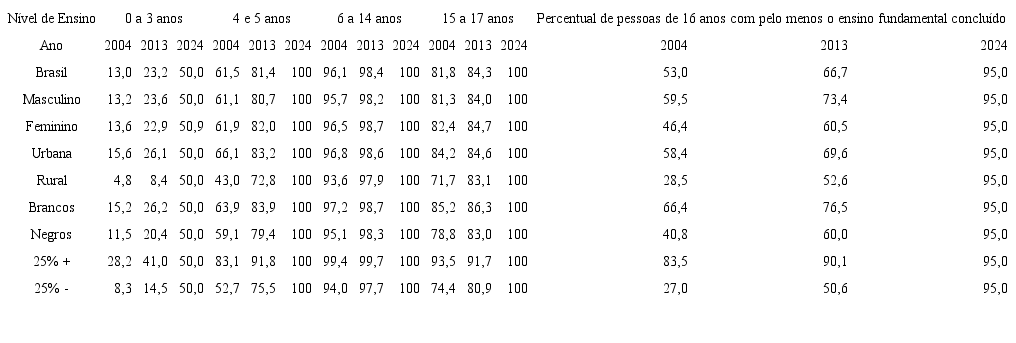 A Tabela 4 apresenta a evolução da frequência escolar nos diversos níveis de ensino nos anos 2004 e 2013 e uma correlação com as metas estabelecidas pelo atual Plano Nacional de Educação (PNE) para o ano 2024.