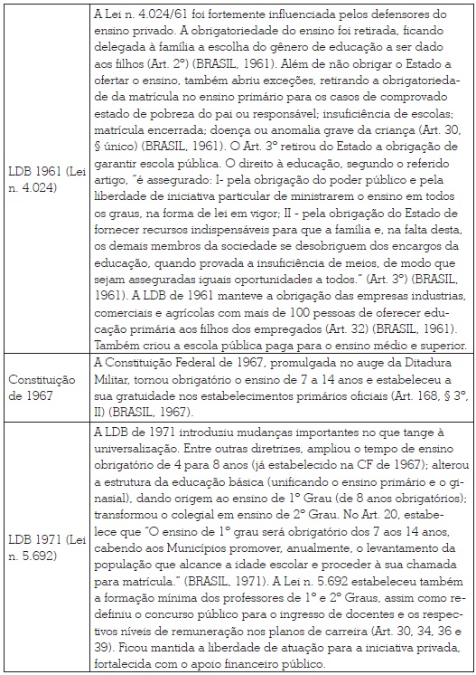 Nos anos seguintes, entre 1961 e 1971, as políticas de universalização da educação básica foram redefinidas várias vezes, cabendo destaque para a Constituição de 1967 e a LDB de 1971.