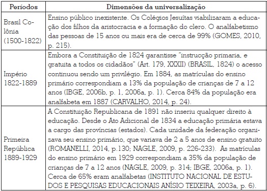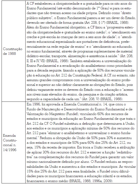 Como demonstrado ao longo deste artigo e sintetizado no Quadro a seguir, a universalização da educação básica no Brasil foi lenta e tardia. A instrução primária, com duração de 2 a 5 anos, foi estruturada a partir de 1920 mediante as reformas estaduais. A escolaridade mínima obrigatória de 8 anos foi estabelecida somente em 1971 (Lei n. 5.692); a de 9 anos em 2006 (Lei n. 11.274) e a de 14 anos (dos 4 aos 17 anos de idade, envolvendo a educação básica, inclusive para os jovens e adultos que não tiveram acesso na idade própria) em 2009 (EC n. 59). A partir de 2016, a educação básica de 4 a 17 anos passou a ser obrigatória e gratuita. A despeito de o Estado brasileiro ter reconhecido a educação como um direito social na década de 1930, foi somente em 1988 que o ensino obrigatório foi assumido pela Constituição como um direito público subjetivo.