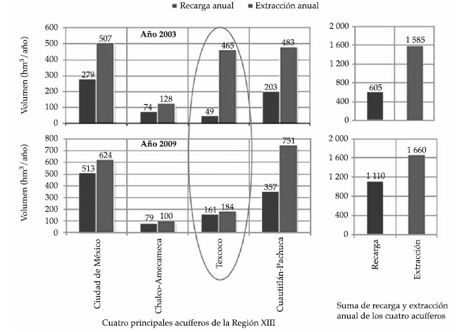 Así, este acuífero era en 2003 el más sobreexplotado de los 14 acuíferos del Valle de México, en donde la extracción de agua subterránea se estimaba nueve veces superior a la recarga. Sin embargo, en un estudio posterior llevado a cabo en 2007 (publicado en el DOF en 2009), la extracción se estimó mayor a la recarga en menos de 15%. Debe destacarse que esta enorme diferencia en las extracciones reportadas se debe en buena medida a que tanto el municipio de Ecatepec como la Delegación Iztapalapa, donde se extraen más de 300 hm3/año, fueron reasignados del acuífero Texcoco a otros acuíferos vecinos. Se entiende menos el enorme aumento en la estimación de la recarga (de 49 hm3/año en 2003, a 161 hm3/año en 2007), ya que en este periodo no se han realizados trabajos significativos de recarga y las diferencias en estas cantidades se pueden deber más a la forma de determinarlas, ya que: