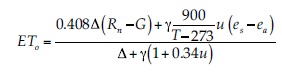 (11)ETo = evapotranspiración de referencia (mm día-1); Rn = radiación neta en la superficie del cultivo (MJ m-2 día-1); Ra = radiación extraterrestre (mm día-1); G = flujo de calor de suelo (MJ m-2 día-1); T = temperatura media del aire (C°); u = velocidad del viento (ms-1); es = presión de vapor de saturación (kPa); ea = presión real de vapor (kPa); es-ea = déficit de presión de vapor (KPa); Δ = pendiente de la curva de presión de vapor (kPa °C-1); Γ= constante psicrométrica (kPa°C-1).