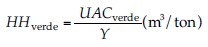 (3)Donde Y (ton/ha) = rendimiento del cultivo (cuadro 1); UAC = uso de agua del cultivo verde y azul, según su fuente (precipitación o riego), expresada en m3/ha (Allen, Pereira, Raes, & Smith, 1998).