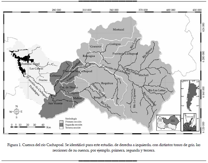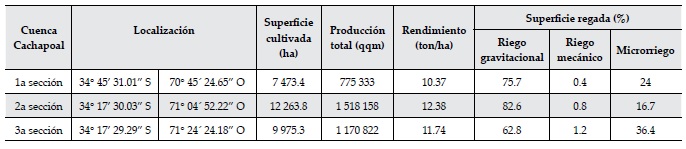 El análisis se realizó separando la cuenca del río Cachapoal en diferentes secciones, según sus variaciones altitudinales, por ejemplo, primera, segunda y tercera secciones (figura 1), además fue necesario emplear datos agrícolas, como superficie cultivada, rendimiento y técnicas de riego en las distintas secciones de la cuenca del Cachapoal (INE, 2007) (cuadro 1).