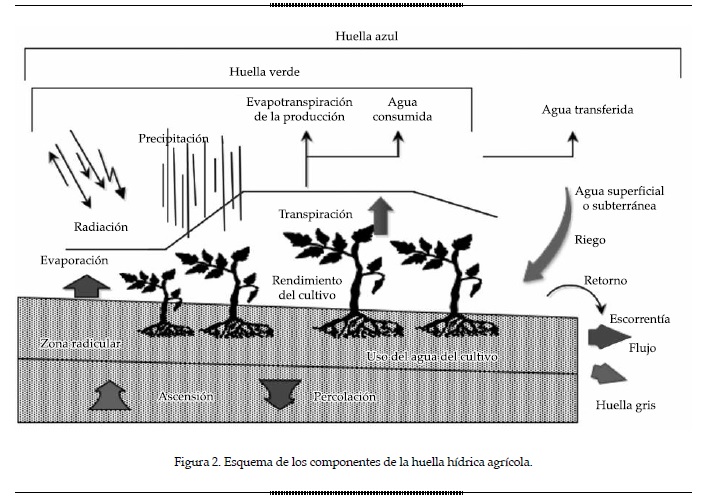 La huella hídrica identifica tres componentes: 1) huella hídrica verde, volumen de agua que se consume en el proceso de producción, como el agua que se encuentra como humedad del suelo en la zona no saturada, formada por la precipitación y disponible para las plantas; 2) huella hídrica azul, agua de riego, que comprende el volumen de agua superficial (ríos, lagos, humedales) o subterránea (acuíferos), que se consume en el proceso de producción; considera las salidas del sistema por evaporación de los cultivos; 3) huella hídrica gris, aquella que se requiere para asimilar los contaminantes generados durante el proceso de producción de cultivos (Hoekstra, 2013; Vanham & Bidoglio, 2013).