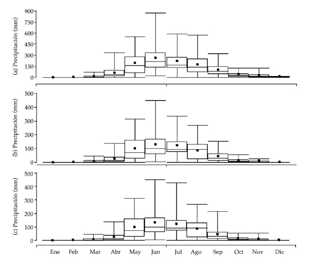 El análisis del comportamiento de las precipitaciones se realizó mediante boxplots, que entrega información sobre el comportamiento de ciclos estacionales y valores extremos en las observaciones (Guenni, Degryze, & Alvarado, 2008). La clasificación de años secos, normales y húmedos se realizó utilizando el método de los percentiles, que define cinco categorías: muy seco (percentil 0-20), seco (percentil 20-40), normal (percentil 40-60), húmedo (60-80) y muy húmedo (80-100) (Valiente, 2001).