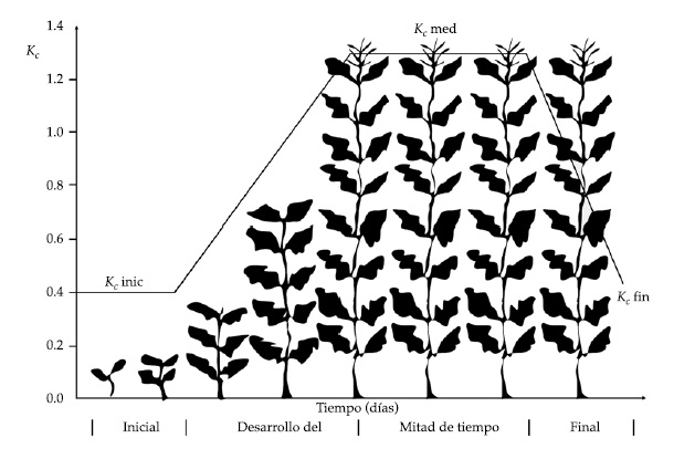 El ciclo de cultivo para el maíz se estimó en 125 días, con las siguientes etapas: inicial, 20 días; desarrollo, 35 días; madurez, 40 días; senescencia, 30 días. Tres valores de coeficiente de cultivo (Kc): 0.30, inicial; 1.20, en la etapa media; 0.35, final, para el periodo septiembre-diciembre (figura 4).