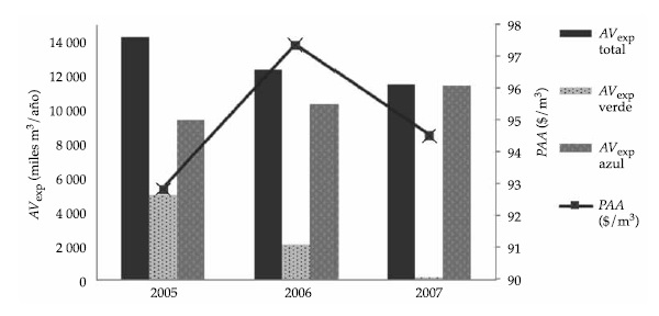 En este estudio se observó que la mayor cantidad de agua virtual total (AVexp) habría sido exportada en el año húmedo (2006) y la menor cantidad en un año seco (2007) debido al mínimo aporte de agua virtual verde; del mismo modo, en un año seco es mayor la cantidad de agua virtual azul exportada, lo que se compensa a través del riego. En particular, en 2007 (año seco), en la zona centro norte del país se registró una fuerte helada en la segunda semana de julio, que afectó a la cuenca del Cachapoal con un periodo de bajas temperaturas, que comprometió de modo grave la producción agrícola (Odepa, 2013a), situación que fue compensada con aumento de riego, lo que se refleja en este indicador (figura 5).