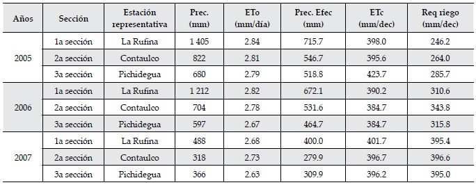 El cuadro 2 resume para cada sección de la cuenca del Cachapoal la información requerida para el cálculo de la huella hídrica. Se comprueba que para el año 2005 (año húmedo) fue mayor la ETo, ETc y la precipitación efectiva, y para el año 2007 (año seco) fue mayor el requerimiento de riego.