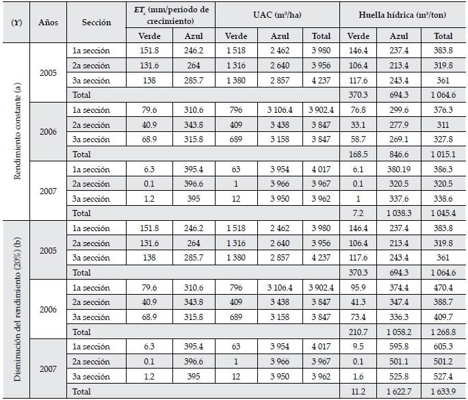 La mayor huella hídrica azul se observó en 2007 (año seco), con 1 038.3 m3/ton, correspondiente a agua de riego (cuadro 3). El test de Tukey mostró diferencias significativas entre un año húmedo, normal y seco; sin embargo, no percibió diferencias significativas entre las secciones (1a, 2a y 3a) (ver cuadro 4). La mayor huella hídrica verde se observó en 2005 (año húmedo) con 370.3 m3/ton (ver cuadro 3). El análisis estadístico mostró diferencias significativas entre un año húmedo, normal y seco. Sin embargo, no mostró diferencias significativas entre las secciones (1a, 2a y 3a) (cuadro 4).