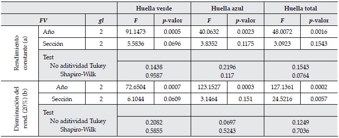 En la evaluación de la huella hídrica, el análisis de normalidad de los datos se hizo a través del test de Shapiro-Wilk. La factibilidad de utilizar un modelo aditivo se analizó aplicando el test de no aditividad de Tukey. Se realizó un análisis de varianza de dos vías para la comparación entre factores, por ejemplo, años (tres niveles, 2005, 2006, 2007) y secciones (tres niveles, 1°, 2°, 3°), y se aplicó la prueba a posteriori de Tukey.