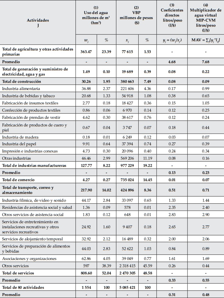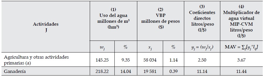 Multiplicando en forma correspondiente los elementos lij (columna de la inversa de Leontief) por los coeficientes de insumos directos de agua yj (vector transpuesto) (p. ej., yj lij ) se obtiene cuántos litros (extra) de agua son directa e indirectamente consumidos por el sector i para generar una unidad monetaria adicional de demanda final en el sector j. Sumando los resultados del vector sobre i se obtiene la cantidad extra de agua virtual para producir un peso adicional de demanda final en el sector j o su multiplicador de agua virtual (MAV). Los multiplicadores de agua virtual para las actividades económicas o sectores de la CVM se registran en la cuarta columna del cuadro 1(p. ej., Σiyjlij) y se logra un multiplicador por actividad económica.
