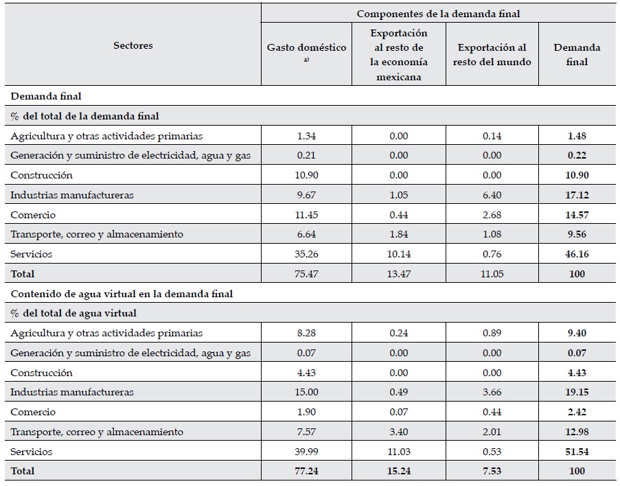 Un resumen del cuadro 2a se presenta en el cuadro 2, en el que las actividades se agruparon en los sectores de agricultura y otras actividades primarias; generación y suministro de electricidad, agua y gas; construcción; industrias manufactureras; comercio; transporte, correo y almacenamiento, y servicios. Los datos muestran porcentajes de la demanda final total (3.209 billones de pesos) y del total de agua virtual requerida para su producción (1 260 hm3).