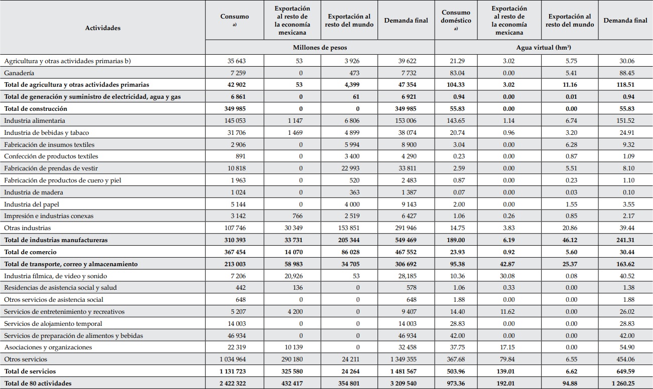 El agua virtual contenida en cada categoría se estima para cada actividad económica. Dichas magnitudes monetarias se multiplican por los MAV correspondientes. Por ejemplo, las exportaciones al resto de México se multiplican por sus MAV,