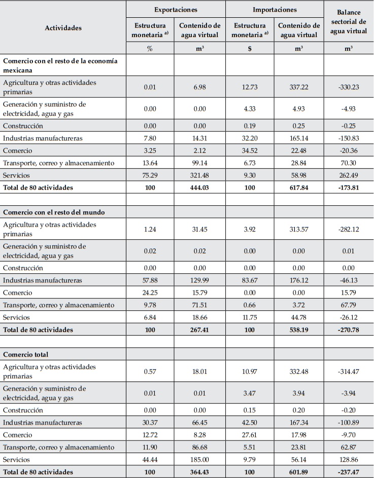 En el cuadro 3 se registra el contenido de agua virtual del comercio de la CVM con el resto de México y el mundo, así como el comercio total. El vector de importaciones sólo cubre los productos que son producidos en la cuenca. La balanza comercial de agua virtual con el resto de la economía de México muestra que la importación de agua virtual representa 1.39 veces las exportaciones de agua, y en el comercio con el resto del mundo, las importaciones representan dos veces las exportaciones de agua virtual. El resultado para la balanza total es que se importa agua en 1.65 veces lo que se exporta, lo que confirma la teoría de Heckscher–Ohlin, en el sentido de que una región con escasez del recurso (como es el caso de la CVM) tiende a importar productos con alto contenido de agua.