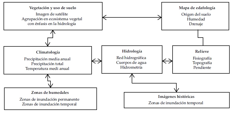A continuación y dentro del ambiente de trabajo de un SIG, mediante técnicas de interpretación asistida por computadora, se generó el polígono que establece el límite de la zona inundable observada en la imagen de satélite tomada en la época húmeda. Después se sobreponen y analizan los polígonos de los cuerpos de agua de la cobertura de la RHI, omitiendo los presentes e incorporando los faltantes al mapa de trabajo; por último, se realiza la fusión de coberturas, para generar una nueva que integra la base de datos de las capas fusionadas, que conserva y asocia los datos que se utilizarán en la nomenclatura y clasificación de los humedales. La ubicación y delimitación de los humedales se obtuvo a partir de la sobreposición de los mapas correspondientes al límite hidrológico de las subcuencas en la zona de estudio con el mapa del Inventario Nacional de Humedales en escala 1:250 000, desarrollado a partir de diferentes capas temáticas: edafología, climatología, hidrología, relieve y regiones ecológicas, empleando un sistema de información geográfica.