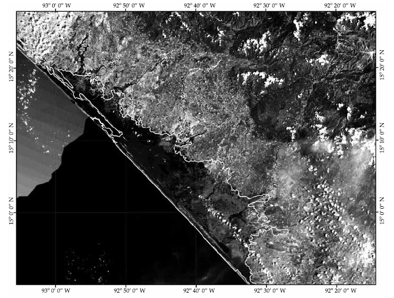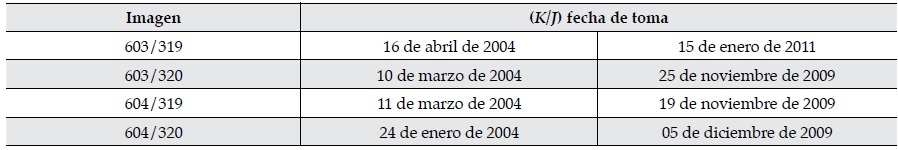 Para apoyar el análisis de la dinámica de la vegetación y uso del suelo en la zona de estudio se emplearon las imágenes Landsat-TM 21-49 y 21-50, con fecha de toma 4 de febrero de 1985 y 15 de enero de 1986, respectivamente, y las imágenes SPOT multiespectrales 603/319, 603/320, 604/319 y 604/320, cuya fecha de toma se encuentra referenciada en el cuadro 1, las cuales se seleccionaron para que a partir de su clasificación y análisis se generaran los mapas de uso del suelo correspondientes a los años 1986, 2004 y 2010. De esta manera se pretende representar los cambios derivados de fenómenos hidrometeorológicos extremos ocurridos en 1989 y 2005, que tuvieron impacto significativo en la zona de estudio.