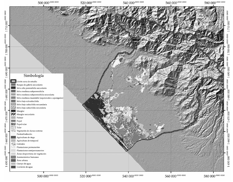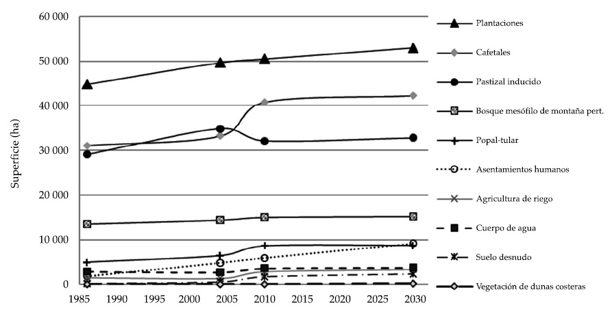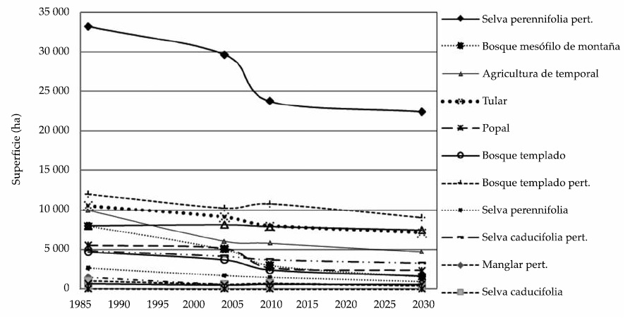De acuerdo con los datos obtenidos, se mantiene una tendencia descendente de las superficies correspondientes a clases de vegetación natural, principalmente de las selvas, bosques y vegetación hidrófita, lo cual puede apreciarse con claridad en el gráfico de tendencia ilustrado en la figura 7; mientras que las coberturas relacionadas con actividades agropecuarias presentan tendencia a incrementarse (figura 8). El análisis espacial del aprovechamiento de los recursos naturales en la cuenca permitió observar una fuerte presión directa e indirecta sobre los sistemas acuáticos. En el caso de afectación directa, se detectó una reducción de la superficie del humedal mediante el drenado de áreas y cambio de uso de suelo, y como afectaciones indirectas se encontró que gran parte de los aprovechamientos realizados tanto en la cuenca alta, media y baja no son compatibles ecológicamente con la vocación del suelo, lo que da origen en la cuenca alta a un proceso de deslizamiento y erosión del suelo, cuyos sedimentos se depositan en especial en la zona de humedal costero ubicado en la cuenca baja, deteriorando de modo continuo las condiciones del hábitat acuático.