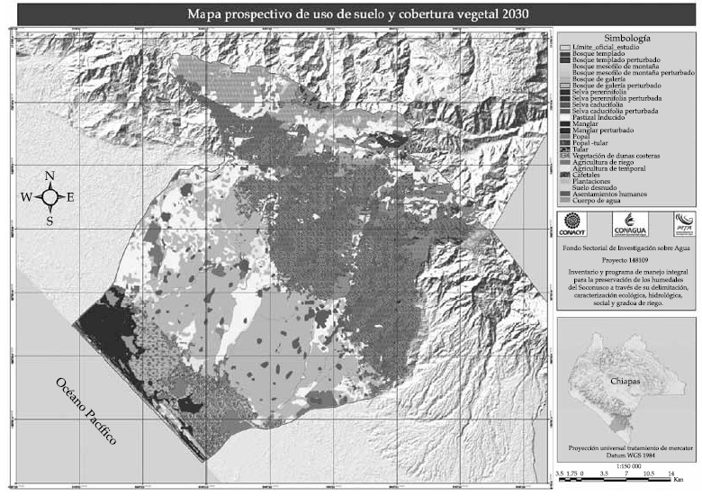 This work analyzes the past and current state of the wetlands located in the study area, on the Pacific slope of the state of Chiapas, Mexico. To this end, remote sensing techniques were applied using satellite images taken in 1986, 2004 and 2010. This was used along with digital thematic mapping processed with a geographic information system to prospectively evaluate the trends in the wetlands’ behavior through the year 2030. As result, a methodology was obtained to delimit wetlands at scales of 1:50000 and 1:20000. Land use and vegetation maps for the three basins in the study area were used as well as a trend map for the year 2030. The temporal analysis of vegetation cover, location and topographical morphology detected problems and threats. A map of critical areas was generated to inform environmental recovery actions and reduce erosion and the risk of landslides which threatens specific localities. It is concluded that a diagnostic of the environmental health of a wetland reflects the effects of the actions taken in different parts of a basin. The information obtained is crucial to evaluate sectoral strategies and develop an integral resource management plan that promotes the economic growth of the region as well as its sustainable use.