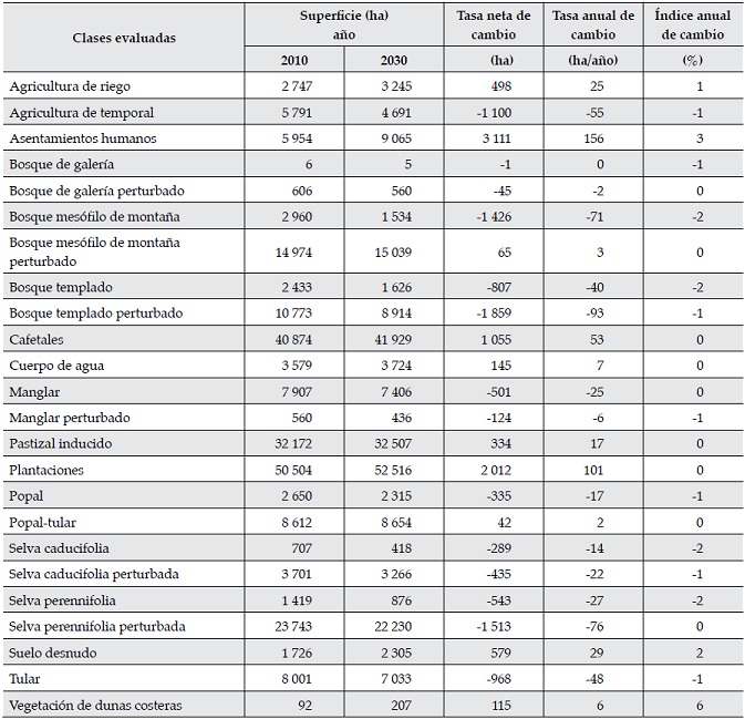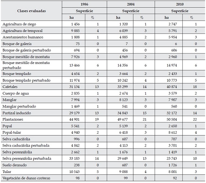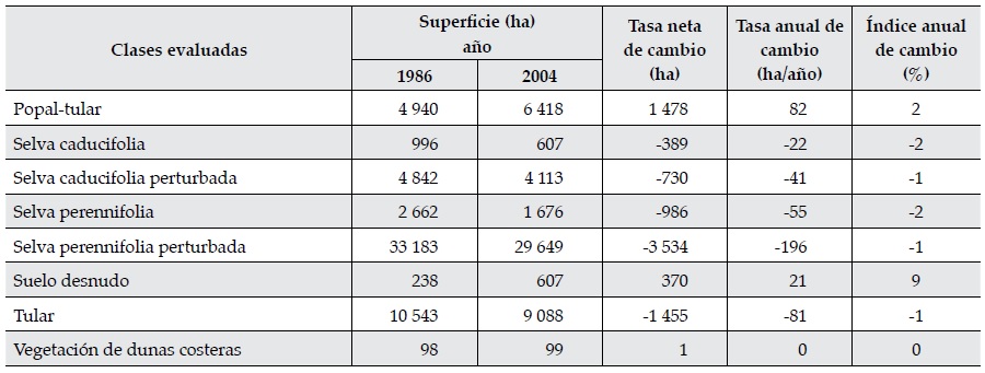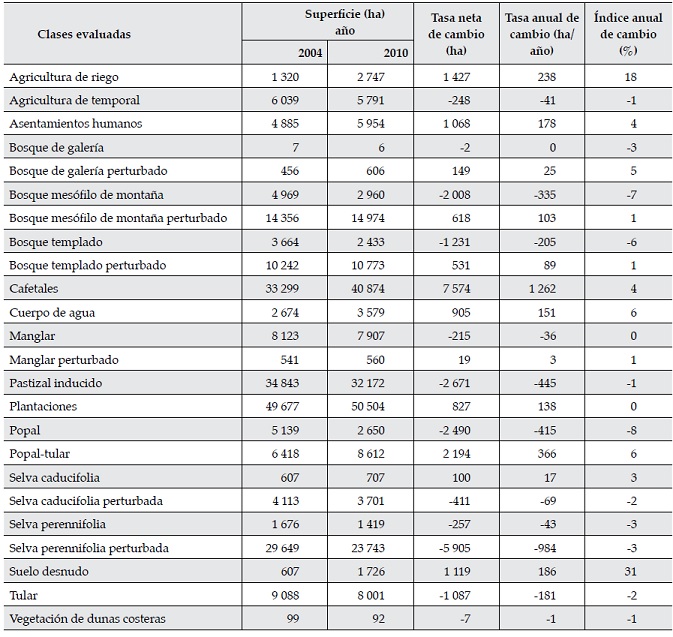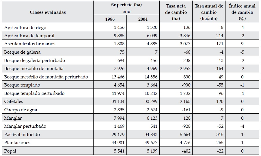 Después se evaluó la tasa neta de cambio de cobertura de cada clase en el periodo 1986 a 2004, y de 2004 a 2010 por clase, presentados en los cuadros 3y4, respectivamente.