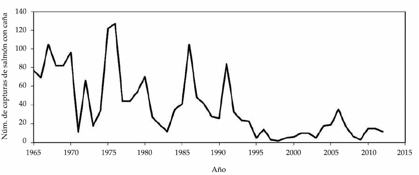 El Masma es un importante río salmonero y truchero del norte de España. Sus aguas frescas y oxigenadas, así como su caudal abundante y estable, favorecen las especies de la familia Salmonidae (Callejo et al., 1982; Xunta de Galicia, 2005), entre las cuales la trucha común (Salmo trutta fario L., 1758) está sometida a gran presión pesquera. La pesca deportiva de dicha especie tiene gran valor económico, no por el precio de los ejemplares capturados (su venta está prohibida por la Ley 7/1992, de pesca fluvial de Galicia) sino por los ingresos indirectos que genera la pesca, que pueden ser muy superiores al valor de las capturas (Arrignon, Tane, & Latreille, 1988). En este río también se encuentra la forma migratoria de la trucha común: el reo o trucha de mar (Salmo trutta trutta L., 1758), que está en expansión y es cada vez más demandada por los pescadores (Xunta de Galicia, 2005). Asimismo, existe una de las seis grandes poblaciones gallegas de salmón (Salmo salar L., 1758) (Morán, Pérez, & García-Vázquez, 2005), apreciándose para esta especie una tendencia decreciente en el número de capturas (figura 1). Aunque los datos de capturas no son un fiel indicador del estado de las poblaciones (Xunta de Galicia, 2005), existe un declive de la especie en el ámbito nacional, que se atribuye a la reducción del hábitat disponible por contaminación y construcción de presas, que dificultan la migración hacia lugares de freza.