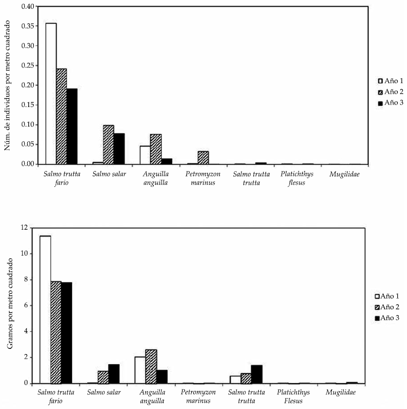 En promedio, para los tres años de inventario, la densidad total fue de 0.38 ind/m2, encontrándose densidades más variables y elevadas en tramos por debajo de los 250 m de altitud y densidades inferiores (0.29 ind/m2) en tramos por encima de los 450 m. La escasa densidad detectada en tramos altos puede deberse a la baja temperatura del agua y, sobre todo, a su baja conductividad (116 μs/cm en promedio), que compromete la eficacia de la pesca eléctrica (García de Jalón et al., 1993).